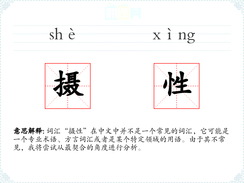 词汇“摄性”在中文中并不是一个常见的词汇,它可能是一个专业术语、方言词汇或者是某个特定领域的用语。由于其不常见,我将尝试从最契合的角度进行分析。