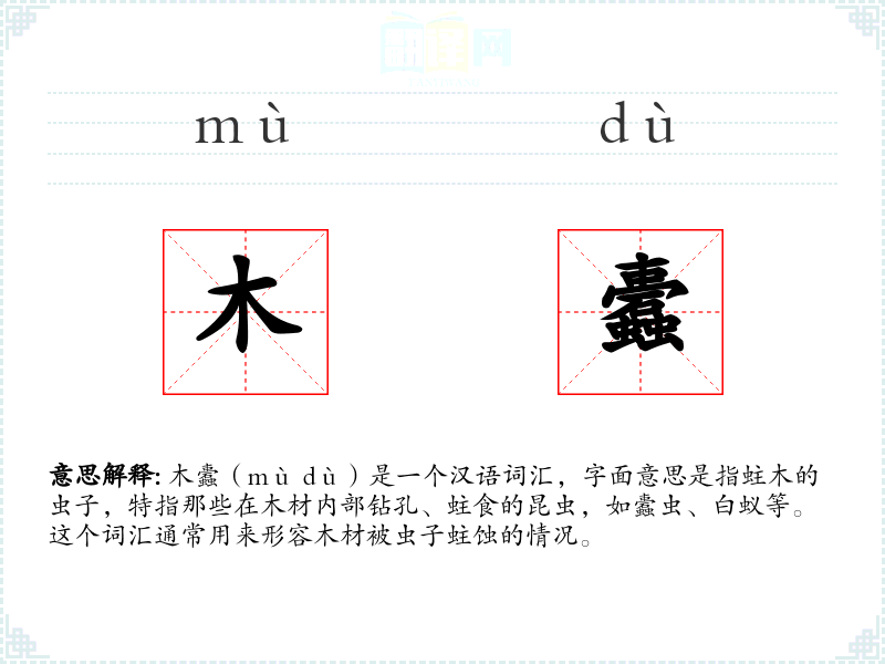 木蠹(mù dù)是一个汉语词汇,字面意思是指蛀木的虫子,特指那些在木材内部钻孔、蛀食的昆虫,如蠹虫、白蚁等。这个词汇通常用来形容木材被虫子蛀蚀的情况。