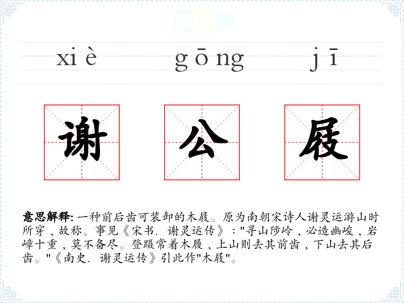 1.一种前后齿可装卸的木屐。原为南朝宋诗人谢灵运游山时所穿﹐故称。事见《宋书.谢灵运传》﹕"寻山陟岭﹐必造幽峻﹐岩嶂十重﹐莫不备尽。登蹑常着木履﹐上山则去其前齿﹐下山去其后齿。"《南史.谢灵运传》引此作"木屐"。