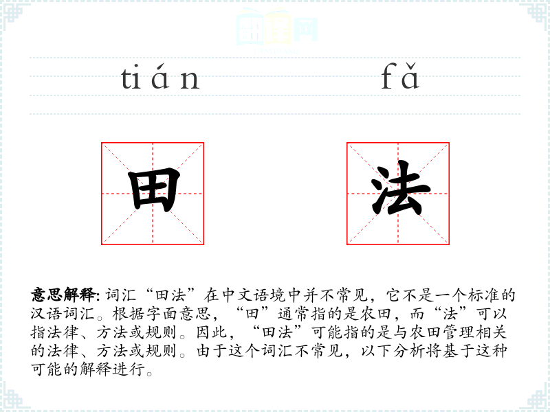 - 反义词:无(由于“田法”不是一个常用词汇,反义词不明显)