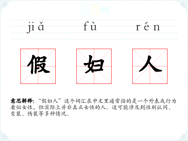 “假妇人”这个词汇在中文里通常指的是一个外表或行为看似女性,但实际上并非真正女性的人。这可能涉及到性别认同、变装、伪装等多种情况。