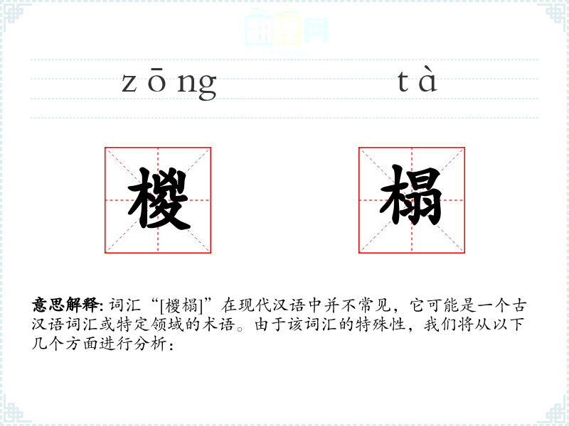 词汇“[椶榻]”在现代汉语中并不常见,它可能是一个古汉语词汇或特定领域的术语。由于该词汇的特殊性,我们将从以下几个方面进行分析: