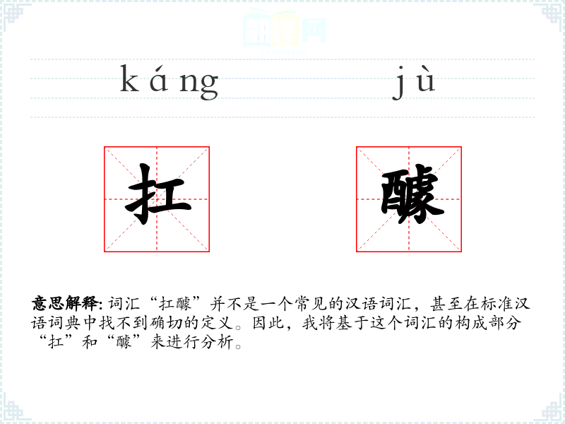 词汇“扛醵”并不是一个常见的汉语词汇,甚至在标准汉语词典中找不到确切的定义。因此,我将基于这个词汇的构成部分“扛”和“醵”来进行分析。