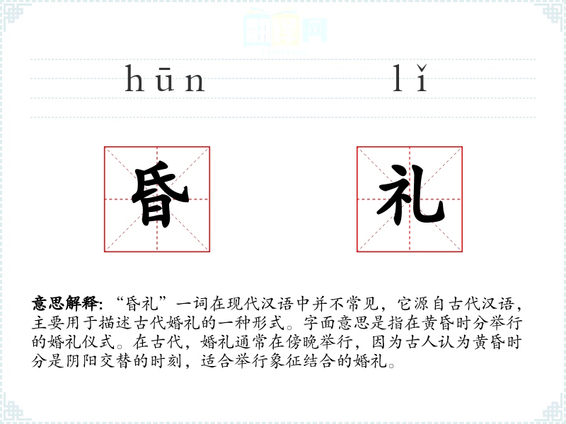 “昏礼”一词在现代汉语中并不常见,它源自古代汉语,主要用于描述古代婚礼的一种形式。字面意思是指在黄昏时分举行的婚礼仪式。在古代,婚礼通常在傍晚举行,因为古人认为黄昏时分是阴阳交替的时刻,适合举行象征结合的婚礼。