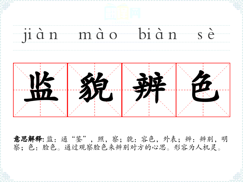 监:通“鉴”,照,察;貌:容色,外表;辨:辨别,明察;色:脸色。通过观察脸色来辨别对方的心思。形容为人机灵。