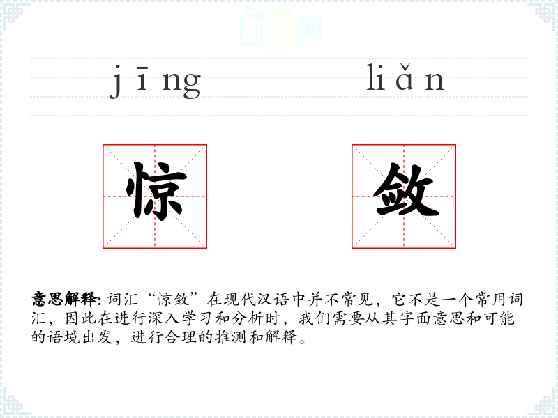 通过对“惊敛”的分析,我们可以看到它是一个较为生僻的词汇,可能在特定的文学或文化语境中使用。了解这样的词汇有助于丰富我们的词汇量,但在日常交流中可能并不常用。在语言学*和表达中,了解这些生僻词汇可以增加我们对语言多样性的认识。