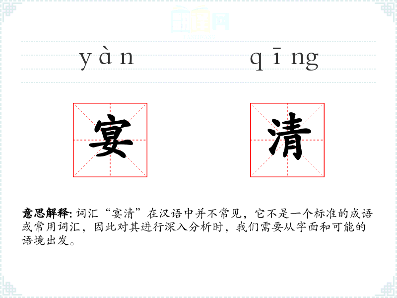 词汇“宴清”在汉语中并不常见,它不是一个标准的成语或常用词汇,因此对其进行深入分析时,我们需要从字面和可能的语境出发。