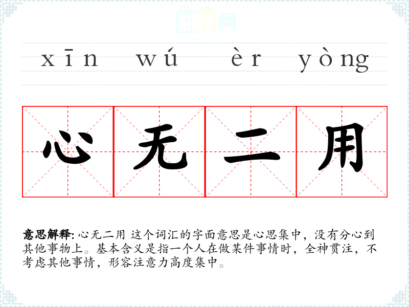 心无二用 这个词汇的字面意思是心思集中,没有分心到其他事物上。基本含义是指一个人在做某件事情时,全神贯注,不考虑其他事情,形容注意力高度集中。