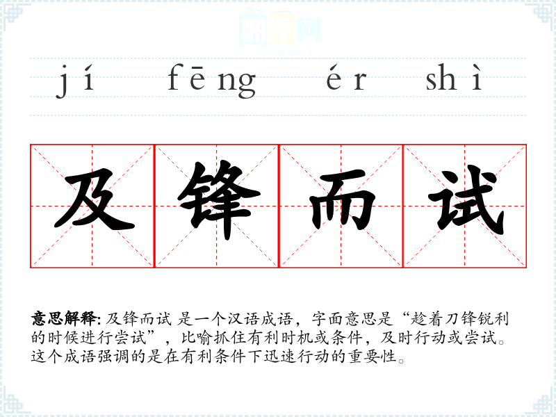 及锋而试 是一个汉语成语,字面意思是“趁着刀锋锐利的时候进行尝试”,比喻抓住有利时机或条件,及时行动或尝试。这个成语强调的是在有利条件下迅速行动的重要性。
