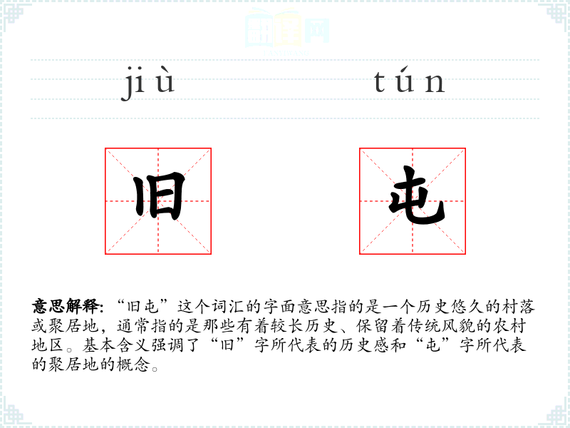 “旧屯”这个词汇的字面意思指的是一个历史悠久的村落或聚居地,通常指的是那些有着较长历史、保留着传统风貌的农村地区。基本含义强调了“旧”字所代表的历史感和“屯”字所代表的聚居地的概念。