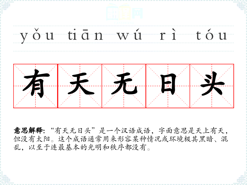 “有天无日头”是一个汉语成语,字面意思是天上有天,但没有太阳。这个成语通常用来形容某种情况或环境极其黑暗、混乱,以至于连最基本的光明和秩序都没有。