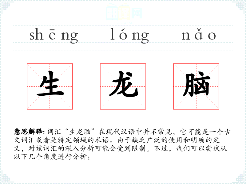 词汇“生龙脑”在现代汉语中并不常见,它可能是一个古文词汇或者是特定领域的术语。由于缺乏广泛的使用和明确的定义,对该词汇的深入分析可能会受到限制。不过,我们可以尝试从以下几个角度进行分析: