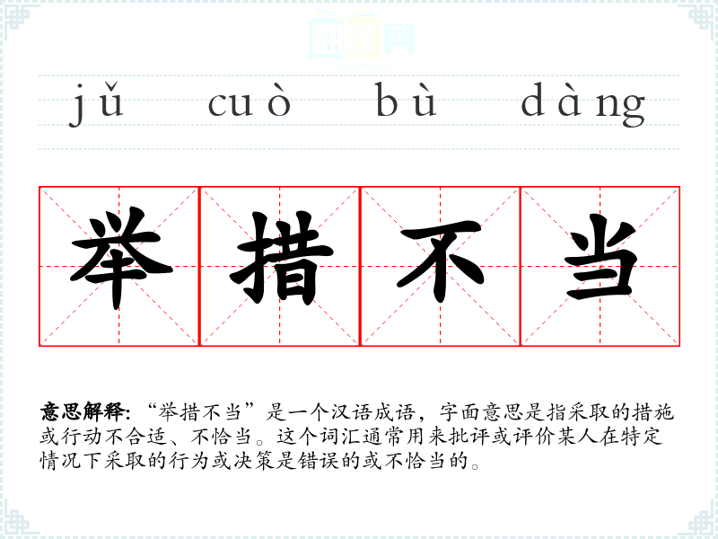 “举措不当”是一个有力的批评词汇,用于评价错误或不恰当的行为。在我的语言学*和表达中,理解和正确使用这个词汇可以帮助我更准确地表达对他人的批评或不满。