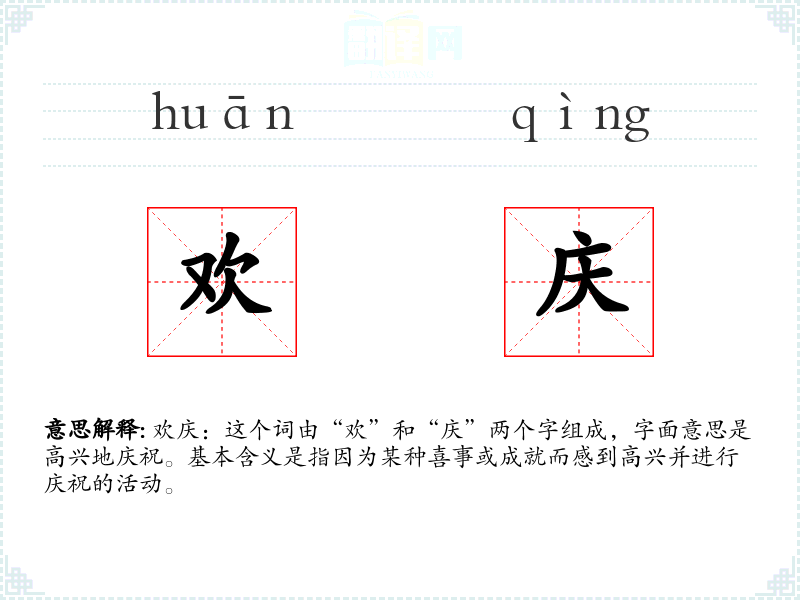 欢庆:这个词由“欢”和“庆”两个字组成,字面意思是高兴地庆祝。基本含义是指因为某种喜事或成就而感到高兴并进行庆祝的活动。