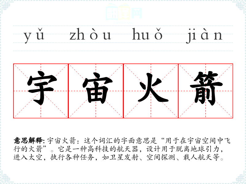 宇宙火箭:这个词汇的字面意思是“用于在宇宙空间中飞行的火箭”。它是一种高科技的航天器,设计用于脱离地球引力,进入太空,执行各种任务,如卫星发射、空间探测、载人航天等。