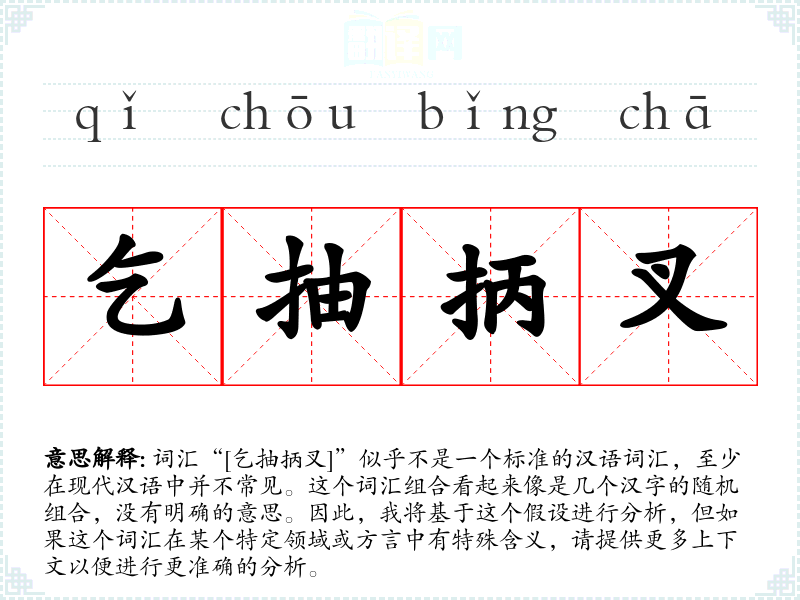词汇“[乞抽抦叉]”似乎不是一个标准的汉语词汇,至少在现代汉语中并不常见。这个词汇组合看起来像是几个汉字的随机组合,没有明确的意思。因此,我将基于这个假设进行分析,但如果这个词汇在某个特定领域或方言中有特殊含义,请提供更多上下文以便进行更准确的分析。