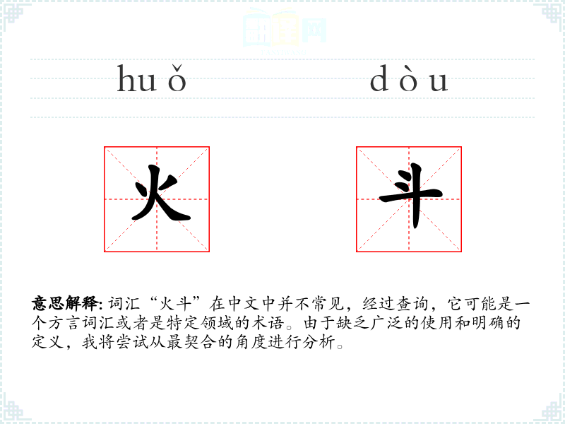 词汇“火斗”在中文中并不常见,经过查询,它可能是一个方言词汇或者是特定领域的术语。由于缺乏广泛的使用和明确的定义,我将尝试从最契合的角度进行分析。