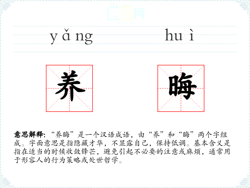 “养晦”是一个汉语成语,由“养”和“晦”两个字组成。字面意思是指隐藏才华,不显露自己,保持低调。基本含义是指在适当的时候收敛锋芒,避免引起不必要的注意或麻烦,通常用于形容人的行为策略或处世哲学。