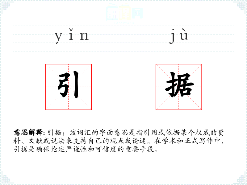 引据:该词汇的字面意思是指引用或依据某个权威的资料、文献或说法来支持自己的观点或论述。在学术和正式写作中,引据是确保论述严谨性和可信度的重要手段。