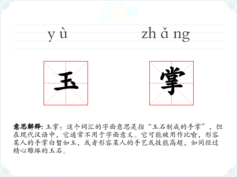玉掌:这个词汇的字面意思是指“玉石制成的手掌”,但在现代汉语中,它通常不用于字面意义。它可能被用作比喻,形容某人的手掌白皙如玉,或者形容某人的手艺或技能高超,如同经过精心雕琢的玉石。