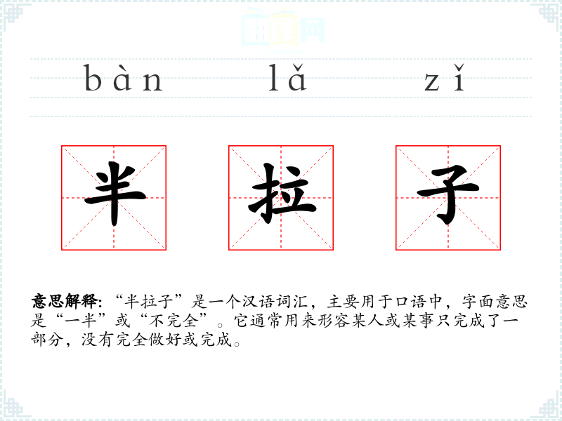 - 口语:在日常对话中,人们常用“半拉子”来形容某人做事不彻底或某件事情只做了一半。