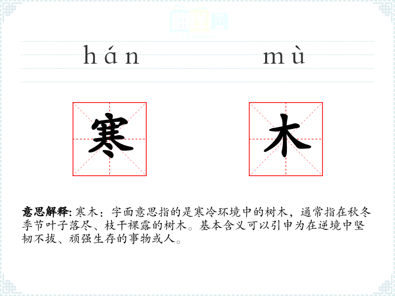 寒木:字面意思指的是寒冷环境中的树木,通常指在秋冬季节叶子落尽、枝干裸露的树木。基本含义可以引申为在逆境中坚韧不拔、顽强生存的事物或人。
