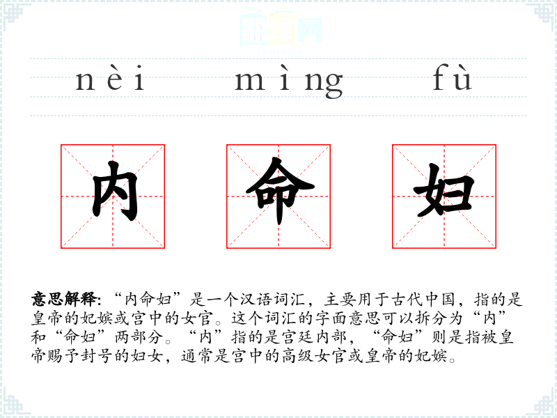 - 反义词:外命妇(指宫外有封号的妇女)