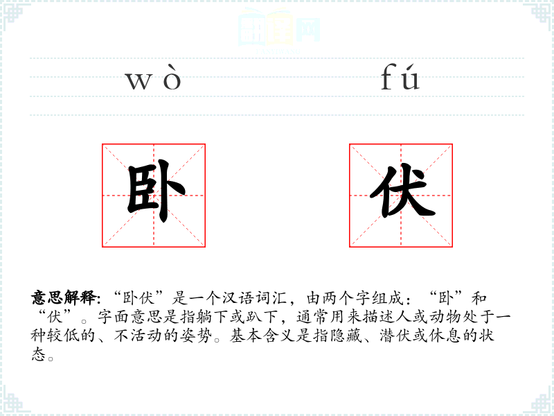 “卧伏”是一个汉语词汇,由两个字组成:“卧”和“伏”。字面意思是指躺下或趴下,通常用来描述人或动物处于一种较低的、不活动的姿势。基本含义是指隐藏、潜伏或休息的状态。