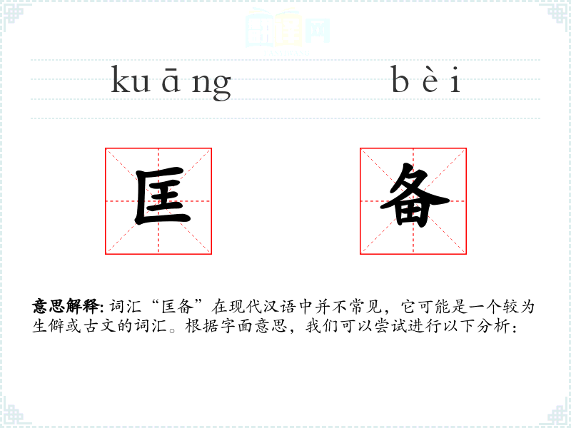 词汇“匡备”在现代汉语中并不常见,它可能是一个较为生僻或古文的词汇。根据字面意思,我们可以尝试进行以下分析: