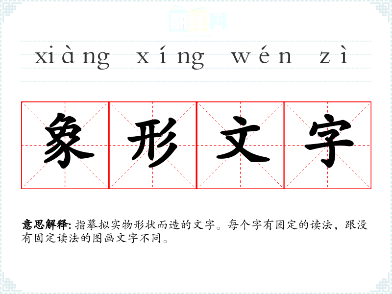 指摹拟实物形状而造的文字。每个字有固定的读法,跟没有固定读法的图画文字不同。