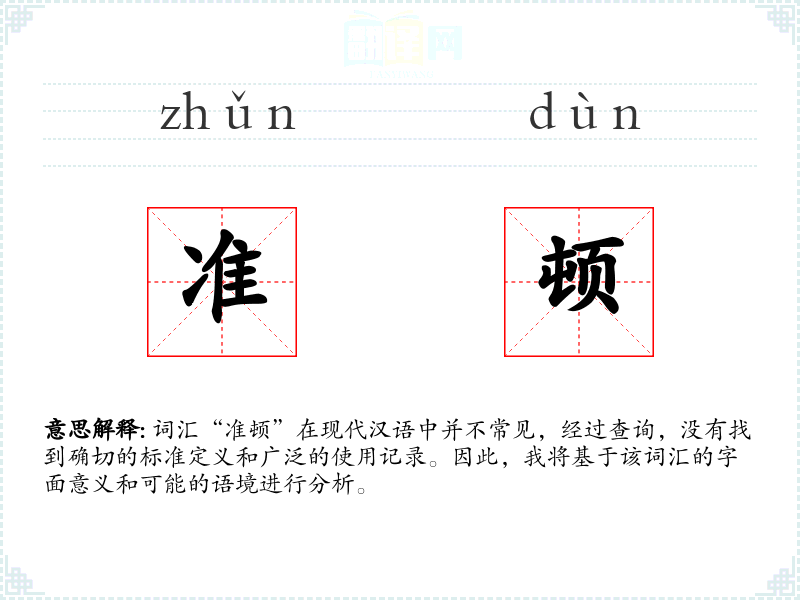 词汇“准顿”在现代汉语中并不常见,经过查询,没有找到确切的标准定义和广泛的使用记录。因此,我将基于该词汇的字面意义和可能的语境进行分析。
