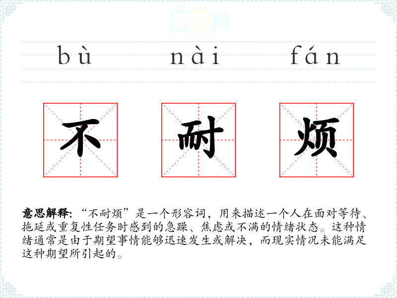 “不耐烦”由“不”和“耐烦”组成。“耐烦”意为忍受烦扰,而“不”作为否定前缀,结合起来表示不能忍受烦扰。这个词在中文中的使用历史悠久,但其具体起源难以追溯。随着社会节奏的加快,这个词的使用频率和重要性也在增加。