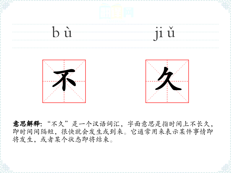 “不久”由“不”和“久”两个字组成,其中“不”表示否定,“久”表示时间长。这个词汇在中文中历史悠久,其基本含义和用法在现代汉语中保持一致。