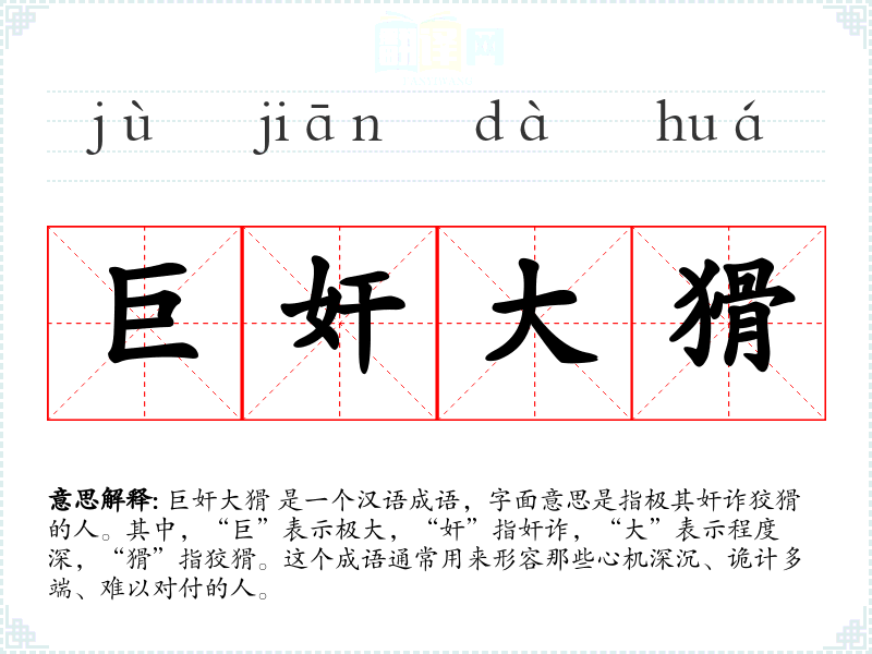 巨奸大猾 是一个汉语成语,字面意思是指极其奸诈狡猾的人。其中,“巨”表示极大,“奸”指奸诈,“大”表示程度深,“猾”指狡猾。这个成语通常用来形容那些心机深沉、诡计多端、难以对付的人。