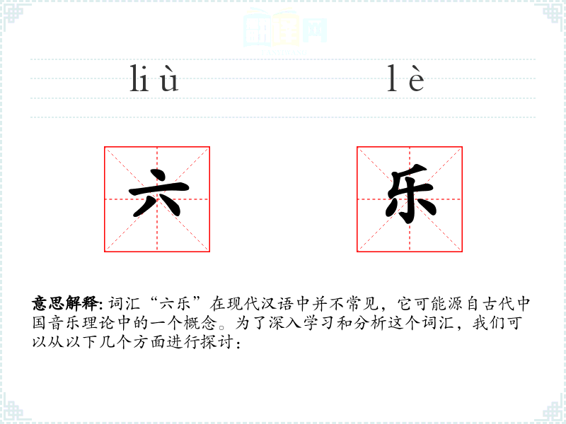 词汇“六乐”在现代汉语中并不常见,它可能源自古代*音乐理论中的一个概念。为了深入学和分析这个词汇,我们可以从以下几个方面进行探讨: