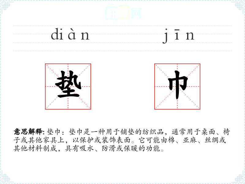 - 反义词:无(垫巾本身是一个具体的物品,没有直接的反义词)