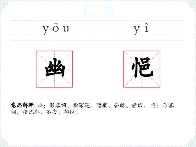 幽:形容词,指深邃、隐蔽、昏暗、静谧。 悒:形容词,指忧郁、不安、郁闷。