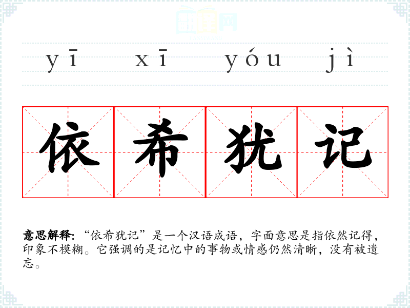 “依希犹记”是一个汉语成语,字面意思是指依然记得,印象不模糊。它强调的是记忆中的事物或情感仍然清晰,没有被遗忘。
