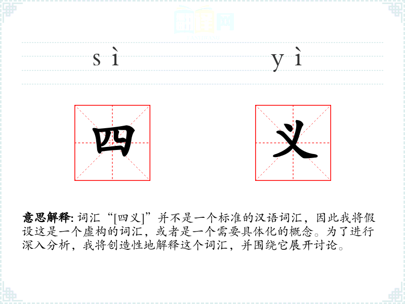 词汇“[四义]”并不是一个标准的汉语词汇,因此我将假设这是一个虚构的词汇,或者是一个需要具体化的概念。为了进行深入分析,我将创造性地解释这个词汇,并围绕它展开讨论。