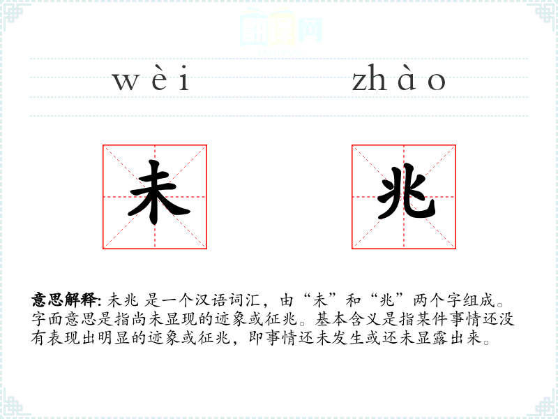 未兆 是一个汉语词汇,由“未”和“兆”两个字组成。字面意思是指尚未显现的迹象或征兆。基本含义是指某件事情还没有表现出明显的迹象或征兆,即事情还未发生或还未显露出来。