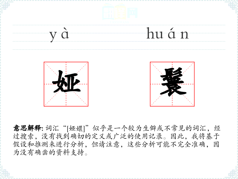 由于“[娅嬛]”不是一个标准词汇,我们无法给出确切的字面意思和基本含义。它可能是某个方言、古文中的词汇,或者是某个特定社群中的术语。