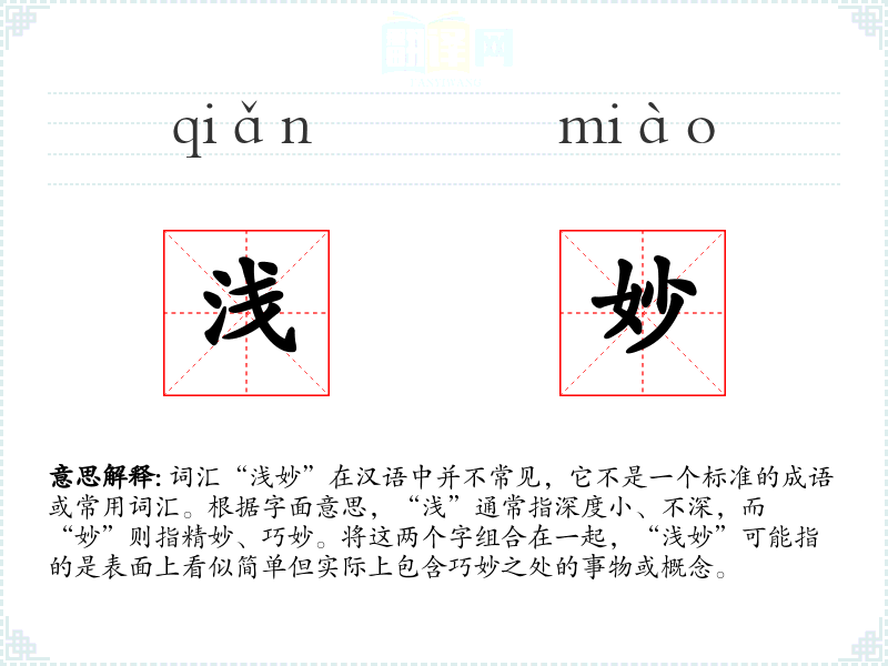 词汇“浅妙”在汉语中并不常见,它不是一个标准的成语或常用词汇。根据字面意思,“浅”通常指深度小、不深,而“妙”则指精妙、巧妙。将这两个字组合在一起,“浅妙”可能指的是表面上看似简单但实际上包含巧妙之处的事物或概念。