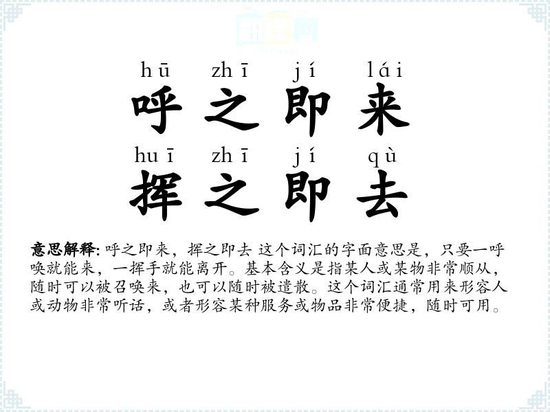 呼之即来,挥之即去 这个词汇的字面意思是,只要一呼唤就能来,一挥手就能离开。基本含义是指某人或某物非常顺从,随时可以被召唤来,也可以随时被遣散。这个词汇通常用来形容人或动物非常听话,或者形容某种服务或物品非常便捷,随时可用。