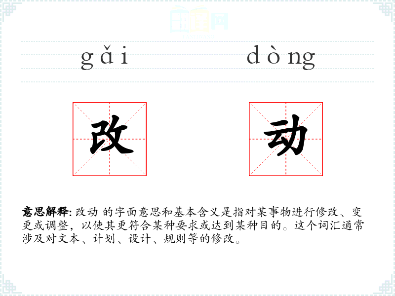 “改动”一词源于汉语,由“改”和“动”两个字组成。在古代汉语中,“改”意味着改变或修正,“动”则表示行动或变化。随着时间的推移,这两个字结合形成了现代汉语中的“改动”,用于描述任何形式的修改行为。
