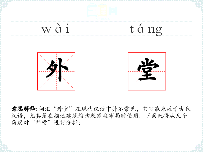 词汇“外堂”在现代汉语中并不常见,它可能来源于古代汉语,尤其是在描述建筑结构或家庭布局时使用。下面我将从几个角度对“外堂”进行分析: