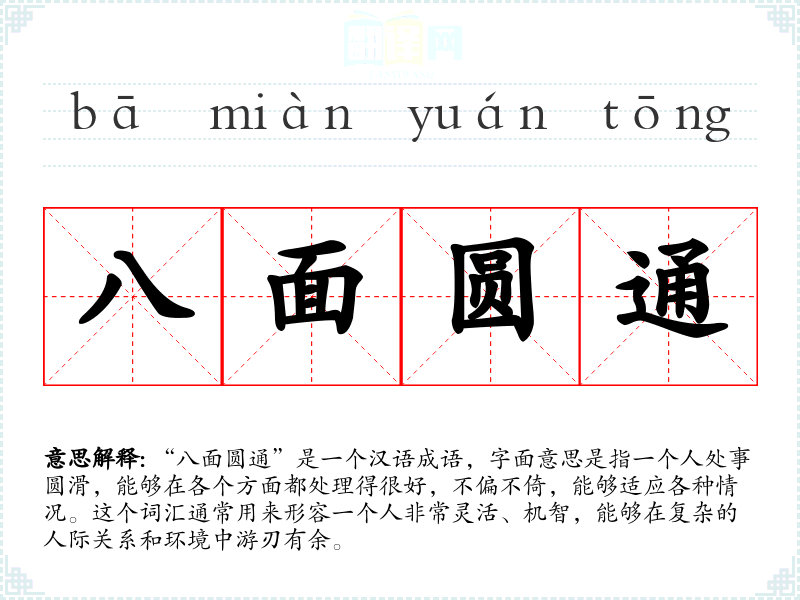 “八面圆通”是一个汉语成语,字面意思是指一个人处事圆滑,能够在各个方面都处理得很好,不偏不倚,能够适应各种情况。这个词汇通常用来形容一个人非常灵活、机智,能够在复杂的人际关系和环境中游刃有余。