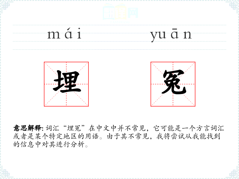 词汇“埋冤”在中文中并不常见,它可能是一个方言词汇或者是某个特定地区的用语。由于其不常见,我将尝试从我能找到的信息中对其进行分析。
