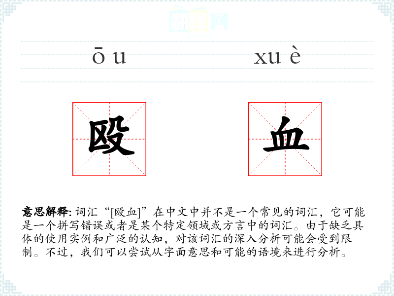 - 对于“殴血”这个词汇的分析受到其不常见和缺乏具体使用实例的限制。在语言学习和表达中,了解常见词汇的准确含义和用法更为重要。如果“殴血”是一个特定领域的术语,了解其在该领域的具体含义和用法将有助于更好地理解和应用。