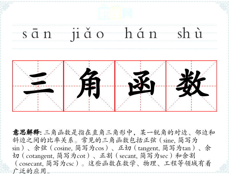 - 反义词: 由于三角函数是特定的数学概念,没有直接的反义词。