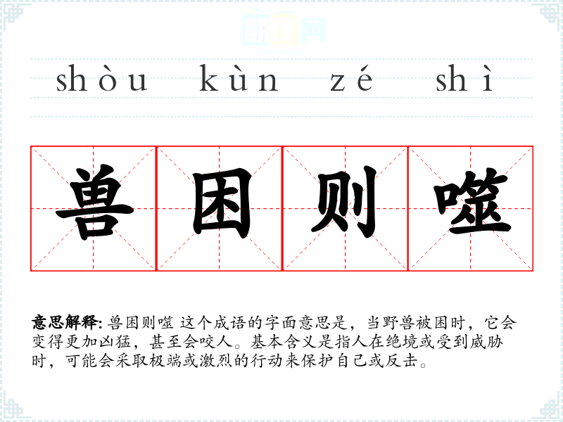 兽困则噬 这个成语的字面意思是,当野兽被困时,它会变得更加凶猛,甚至会咬人。基本含义是指人在绝境或受到威胁时,可能会采取极端或激烈的行动来保护自己或反击。